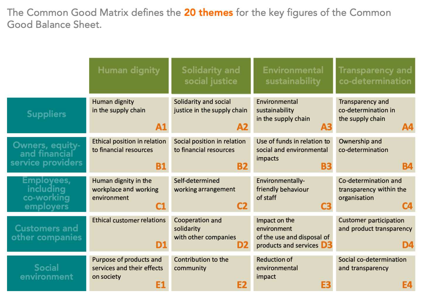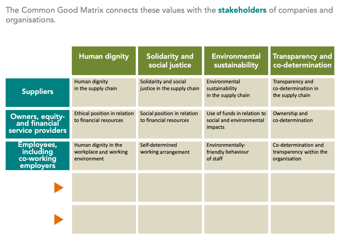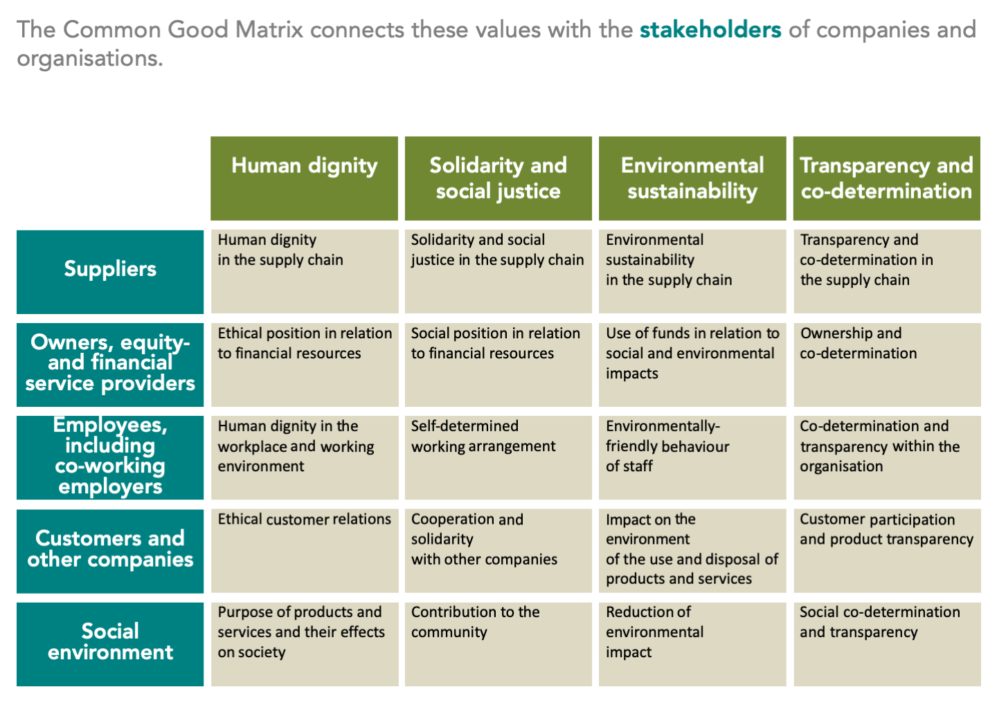 The Common Good Matrix is a model for the organizational development and evaluation of entrepreneurial as well as charitable activities. It assesses and scores the contribution to the common good. The values shown in the columns are those which promote successful relationships and a good life. The rows reflect the five stakeholder groups which an organization has most contact with. In the intersections between the values and the stakeholder groups, 20 common good themes describe and evaluate an organization’s contribution to the common good.