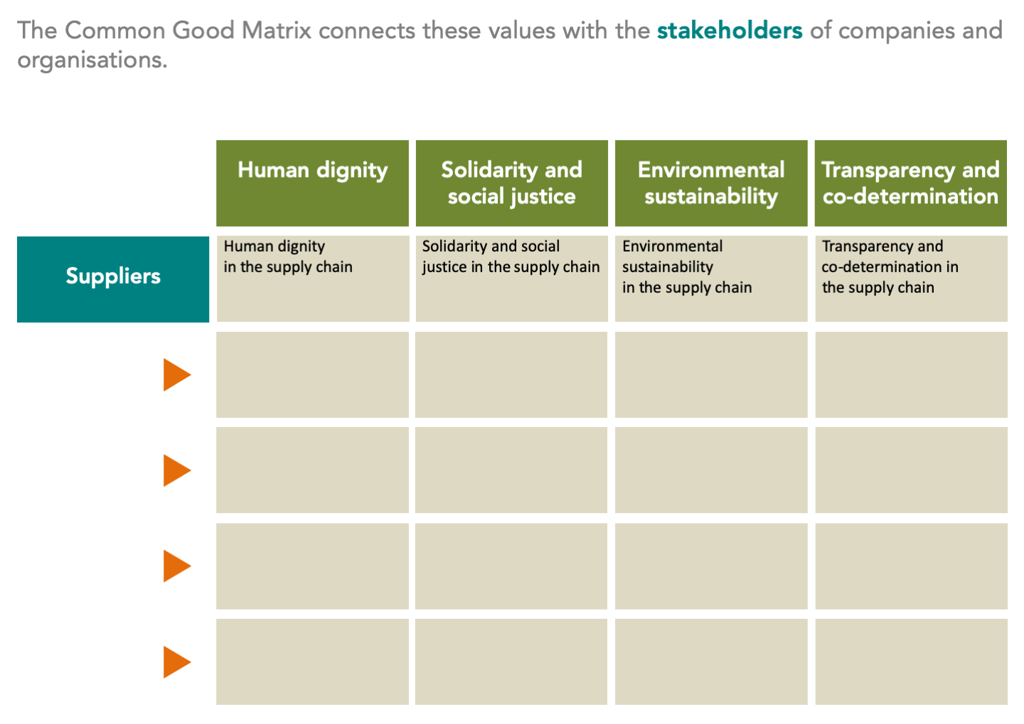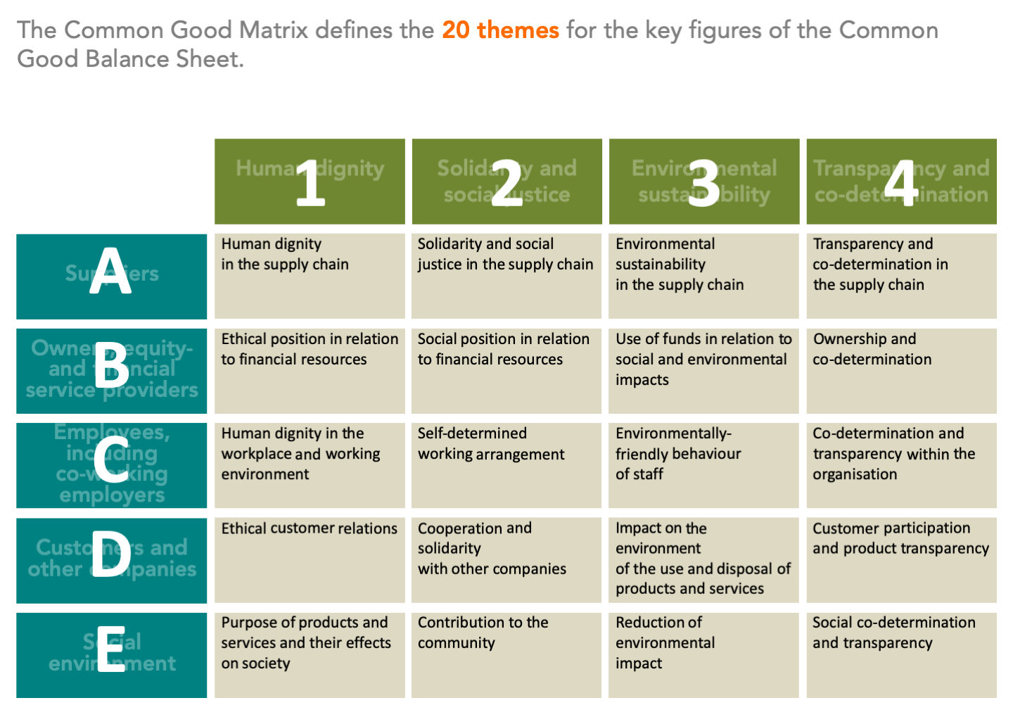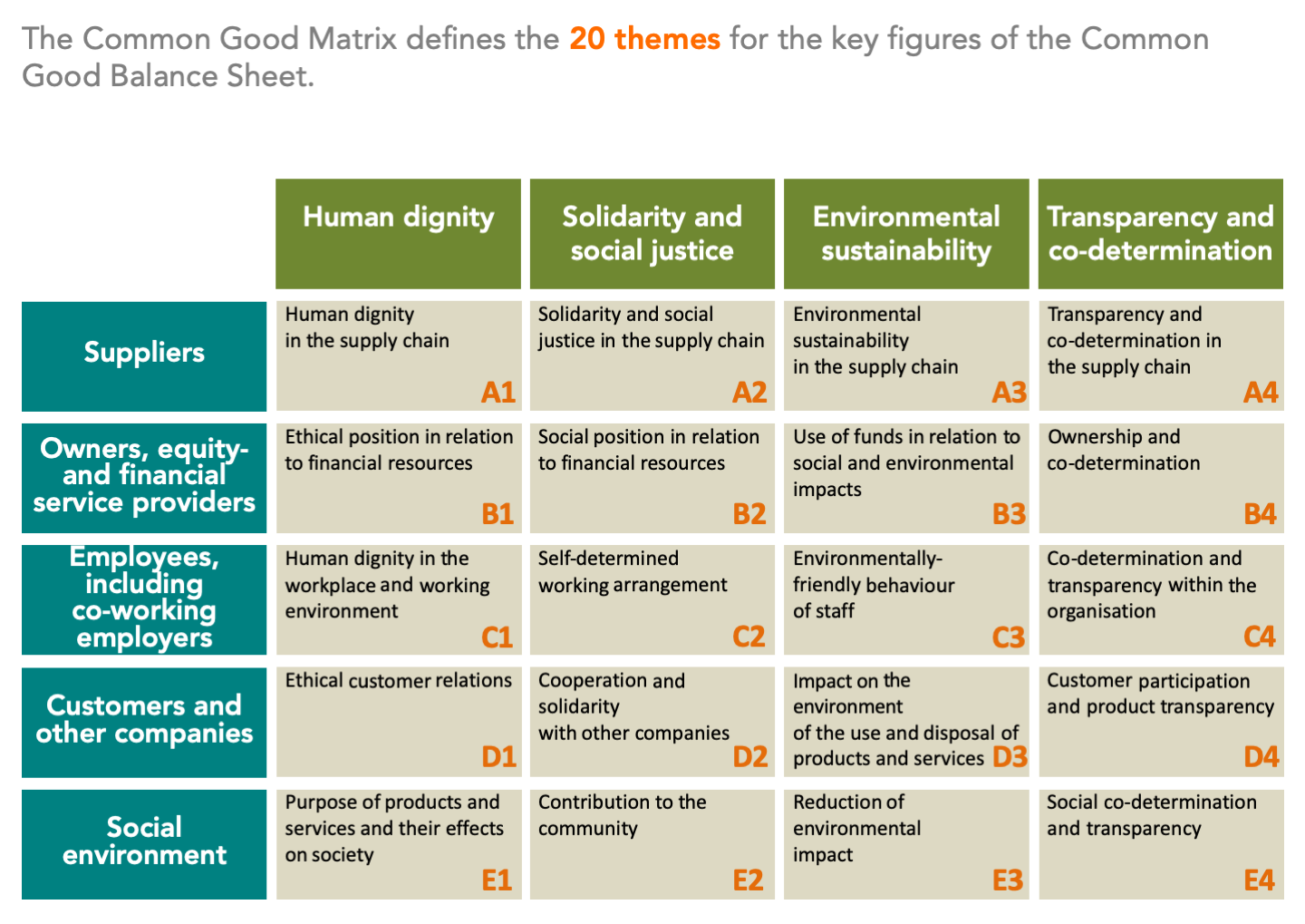 The Common Good Matrix is a model for the organizational development and evaluation of entrepreneurial as well as charitable activities. It assesses and scores the contribution to the common good. The values shown in the columns are those which promote successful relationships and a good life. The rows reflect the five stakeholder groups which an organization has most contact with. In the intersections between the values and the stakeholder groups, 20 common good themes describe and evaluate an organization’s contribution to the common good.
