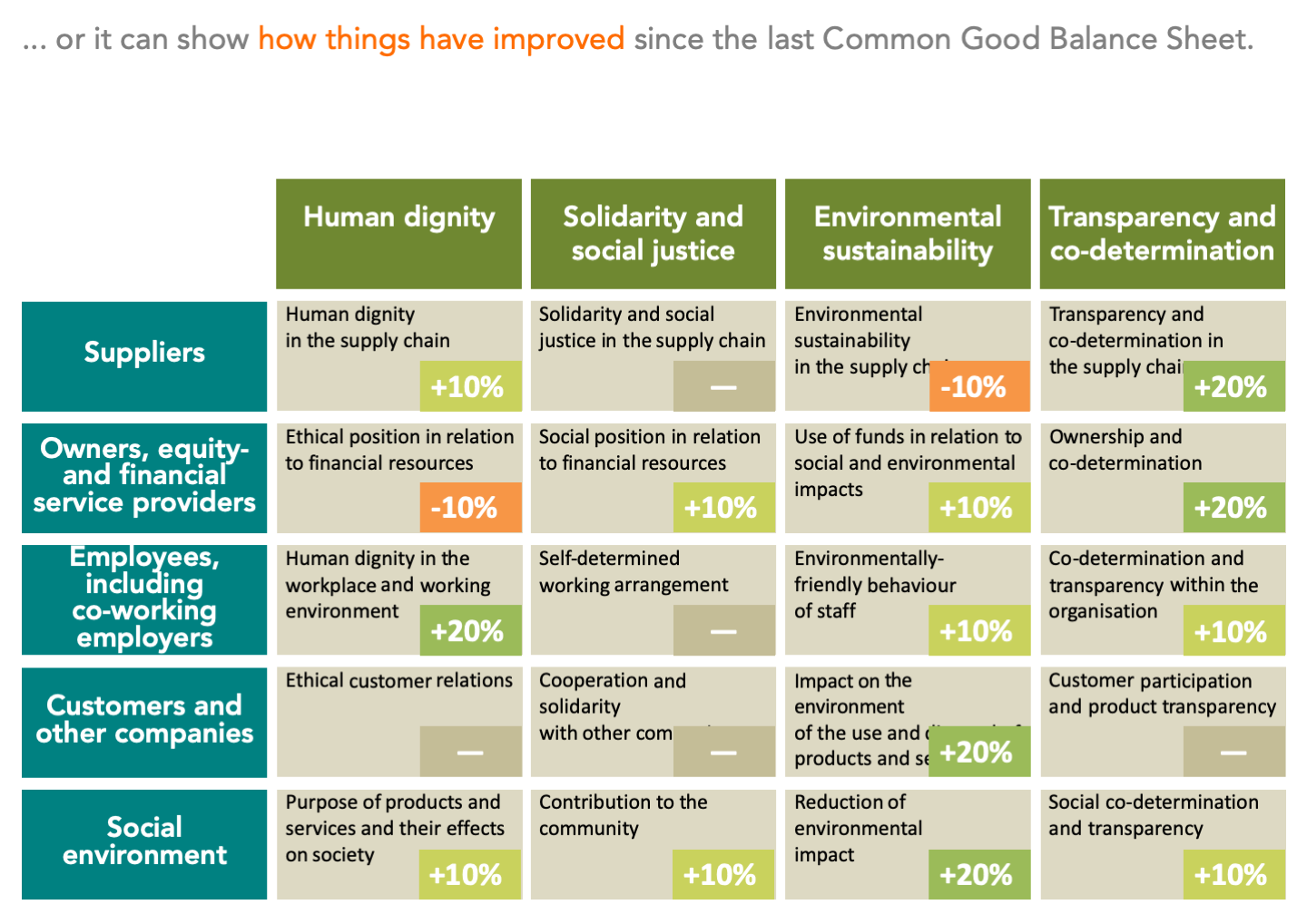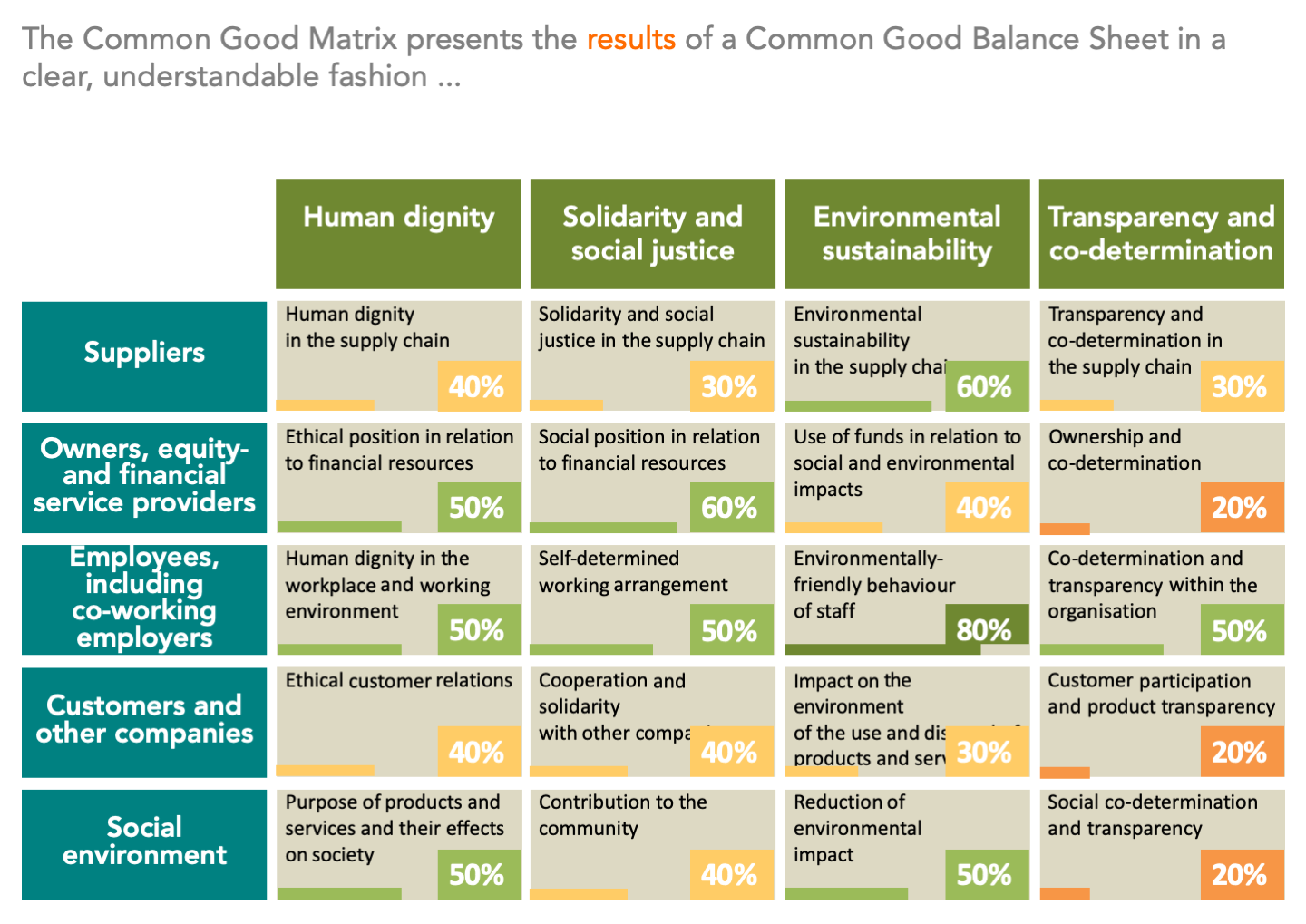 Using the Common Good Matrix, results show a company’s contribution to the Common Good. It becomes clear how fair, sustainable and transparent they are.